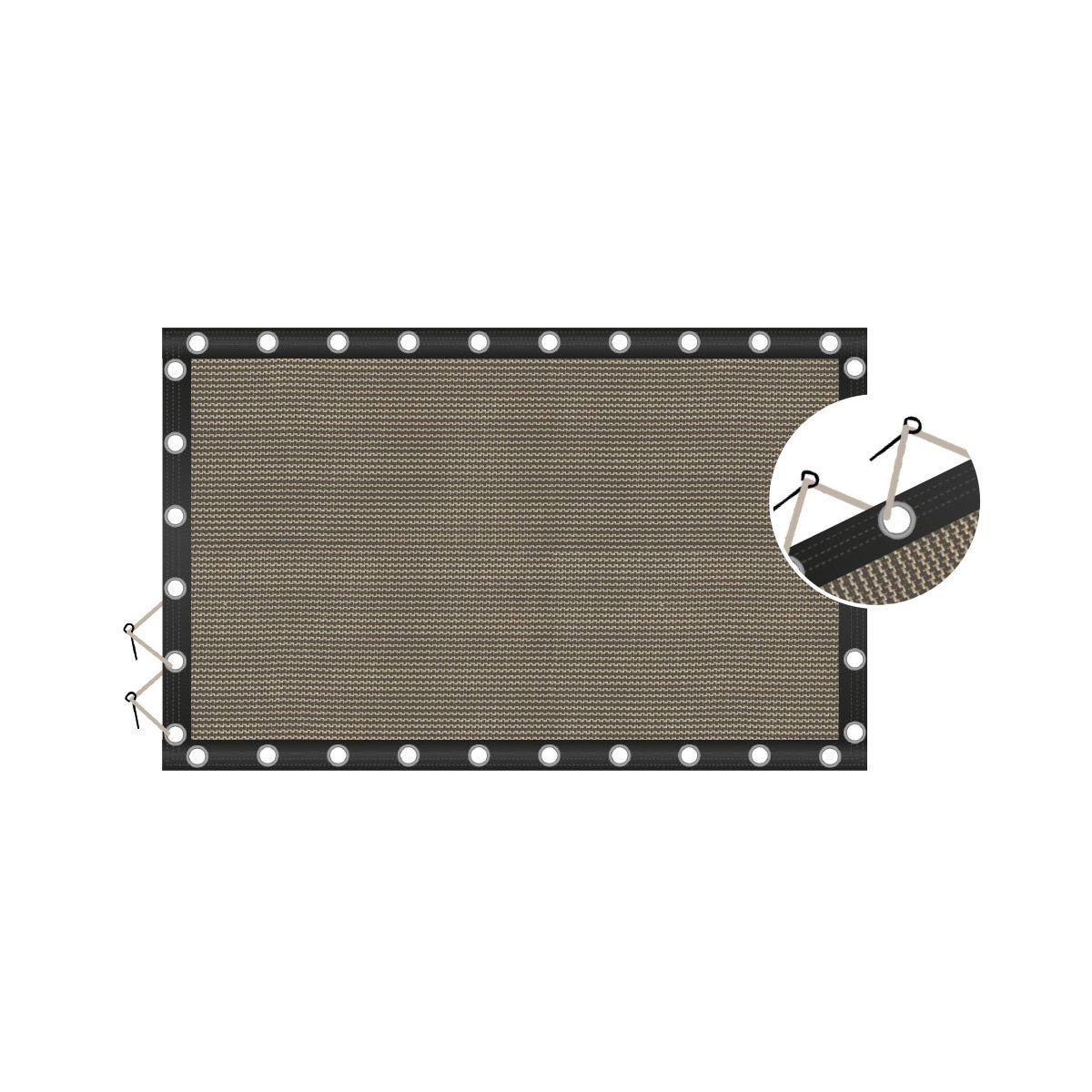 Des œillets en laitons sont présents sur la bâche tous les 1,20m, permettant de l’attacher via un système de sandow périphérique (courant le long de la bâche).